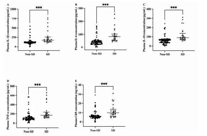 血浆炎症标志物检测揭示,睡眠障碍组IL-1β、IL-6、IL-10、TNF-α及CRP水平均显著高于对照组(p<0.001,图1)。线性回归证实E-DII评分与上述五种标志物水平呈正相关(βIL-1β=0.066,p<0.001;βIL-6=0.055,p=0.021;βIL-10=0.079,p<0.001;βTNF-α=0.059,p=0.003;βCRP=0.050,p=0.023)。