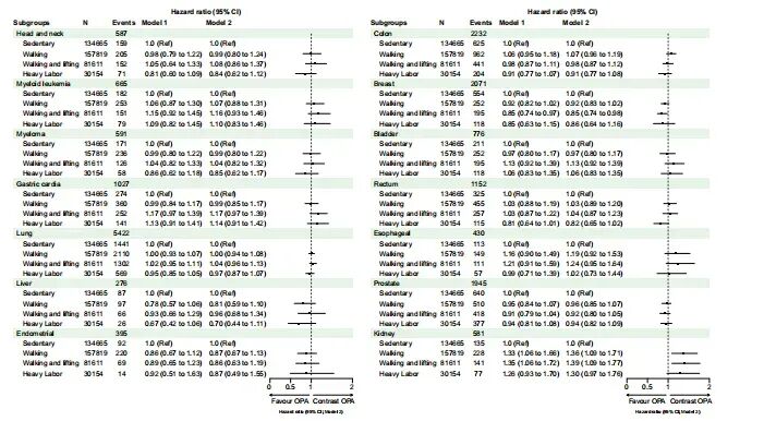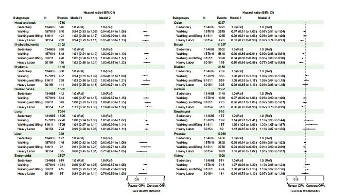 图1:职业性体力活动与14种癌症发病率的关联(n=404,249)
