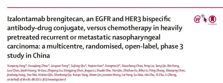 2025年10月,《柳叶刀》在线发表了一篇题为"Izalontamab brengitecan, an EGFR and HER3 bispecific antibody–drug conjugate, versus chemotherapy in heavily pretreated recurrent or metastatic nasopharyngeal carcinoma: a multicentre, randomised, open-label, phase 3 study in China"的文章,首次在III期研究中证实了这一创新药物的价值。