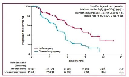 值得注意的是,iza-bren组发生4例(2%)治疗相关死亡,主要归因于发热性中性粒细胞减少和血小板减少,而化疗组无治疗相关死亡。预防性使用G-CSF、升血小板药物和输血支持在iza-bren组更常见。免疫原性分析显示仅1%患者产生抗药抗体。生活质量评估两组无显著差异。