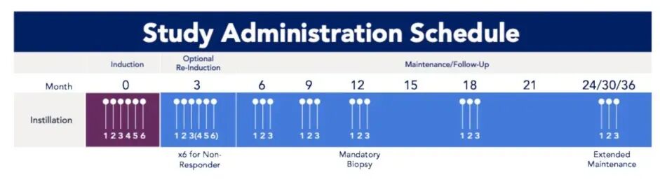 疗效评估包括连续膀胱镜检查、尿液细胞学检查,以及12个月时的强制定位活检,所有病理由中心实验室统一复核。主要终点为任意时间点的完全缓解率(CR);关键次要终点包括无膀胱切除术生存期(CFS)、无进展生存期(PFS)、缓解持续时间(DoR)等。安全性评估涵盖不良事件发生率、严重程度、治疗相关停药率等。中位随访25.8个月(截至2025年6月23日数据截止)。