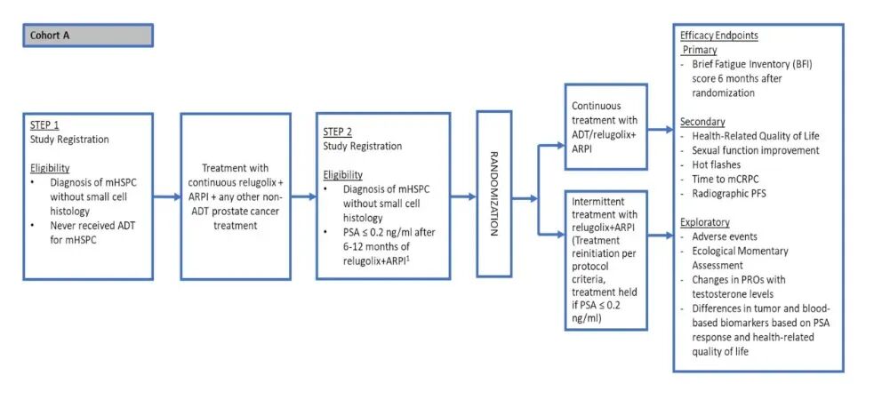 研究计划招募160例患者,分为两个队列。队列A采用“学习-随机”两步法设计:第一步为学习注册期,纳入无小细胞神经内分泌分化的mHSPC初治患者,接受Relugolix+ARPI±标准治疗;第二步为随机化期,治疗6-12个月后PSA达到≤0.2 ng/mL的患者按1:1随机分配至持续治疗组(Relugolix+ARPI连续使用)或间歇治疗组(根据方案标准暂停治疗,PSA回升至特定阈值后重新开始)。这种设计确保只有生物标志物筛选的"最佳响应者"才能进入去升级测试,既保障安全性,又提高试验效率。