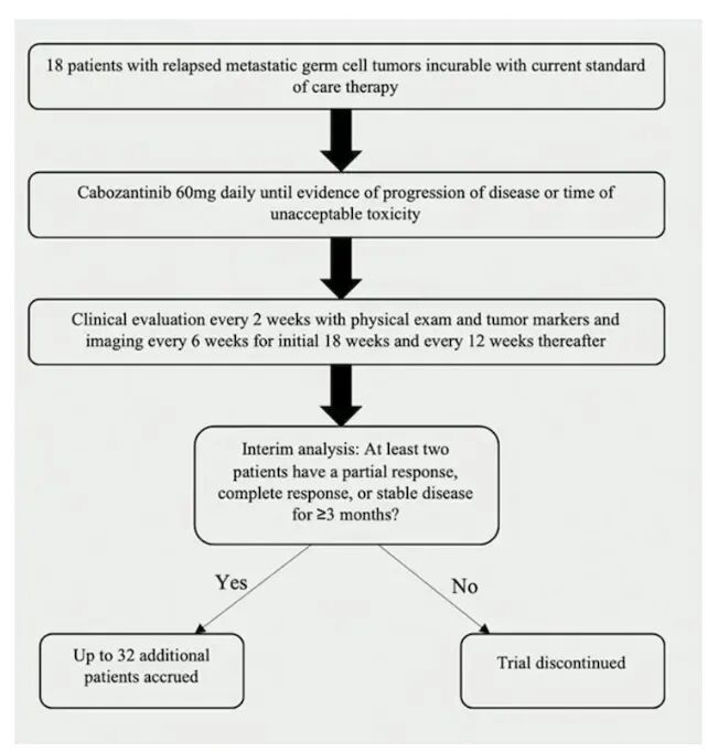 本研究是一项采用Simon两阶段设计的单臂Ⅱ期临床试验,旨在评估卡博替尼口服治疗在不可治愈的复发/难治性生殖细胞肿瘤患者中的临床活性与安全性。