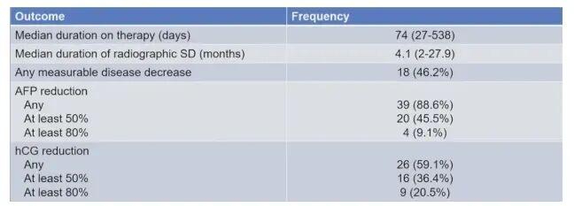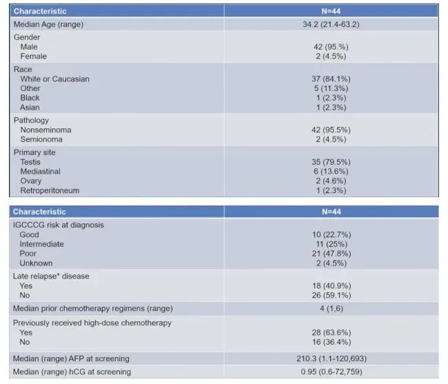 Simon第一阶段既定目标达成,研究顺利扩展至第二阶段,最终共有44例患者纳入疗效分析,其中女性患者2例。入组患者的中位年龄为34.2岁(范围:21.4-63.2岁),95.5%(42/44)为非精原细胞瘤,这一分布与复发难治性人群中非精原细胞瘤占主导的临床特征相符。原发肿瘤部位分布为:睾丸79.5%,纵隔13.6%,卵巢4.6%,腹膜后2.3%。根据国际生殖细胞肿瘤协作组(IGCCCG)预后分层,初诊时风险状态分布为:良好22.7%,中等25%,差47.8%,未知4.5%,提示该队列整体预后风险偏高。值得注意的是,40.9%(18/44)的患者为晚期复发,即一线治疗完全缓解后超过两年复发,这类患者通常对挽救化疗敏感性较低。治疗史方面,患者既往接受化疗方案的中位数为4线,63.6%曾接受高剂量化疗联合外周血干细胞移植,印证了该人群"重度预处理"的特征。基线肿瘤标志物水平显示中位AFP为210.3 ng/mL(范围:1.1-120,693),中位hCG为0.95 IU/L(范围:0.6-72,759),标志物水平差异悬殊,反映了肿瘤生物学行为的异质性。