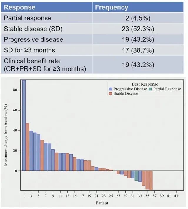 主要终点临床获益率达到43.2%(19/44),其中部分缓解率4.5%(2/44),疾病稳定率38.6%(17/44),且稳定持续时间均≥3个月。未见完全缓解病例。这一结果虽未达传统细胞毒性化疗在敏感复发患者中的缓解率水平,但考虑到入组患者均经过多线治疗且为公认不可治愈人群,超过四成的疾病控制率仍具有临床意义。