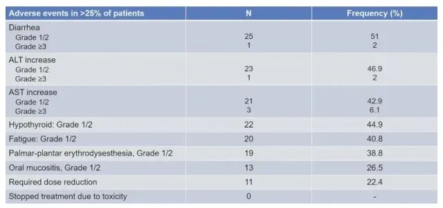 安全性方面,最常见的不良事件为腹泻,发生率59.1%,其中绝大多数(96.2%)为1-2级,提示该毒性可通过支持治疗管理。最常见的≥3级不良事件为AST升高,发生率6.8%,整体肝毒性可控。共有11例患者(25%)需要剂量减量,2例患者仍在接受治疗时研究数据锁定。