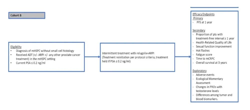 队列B为独立单臂探索组,纳入60例因转移性疾病启动ADT且PSA已达≤0.2 ng/mL的患者,计划接受Relugolix+ARPI间歇治疗,评估该策略在更广泛人群中的可行性。